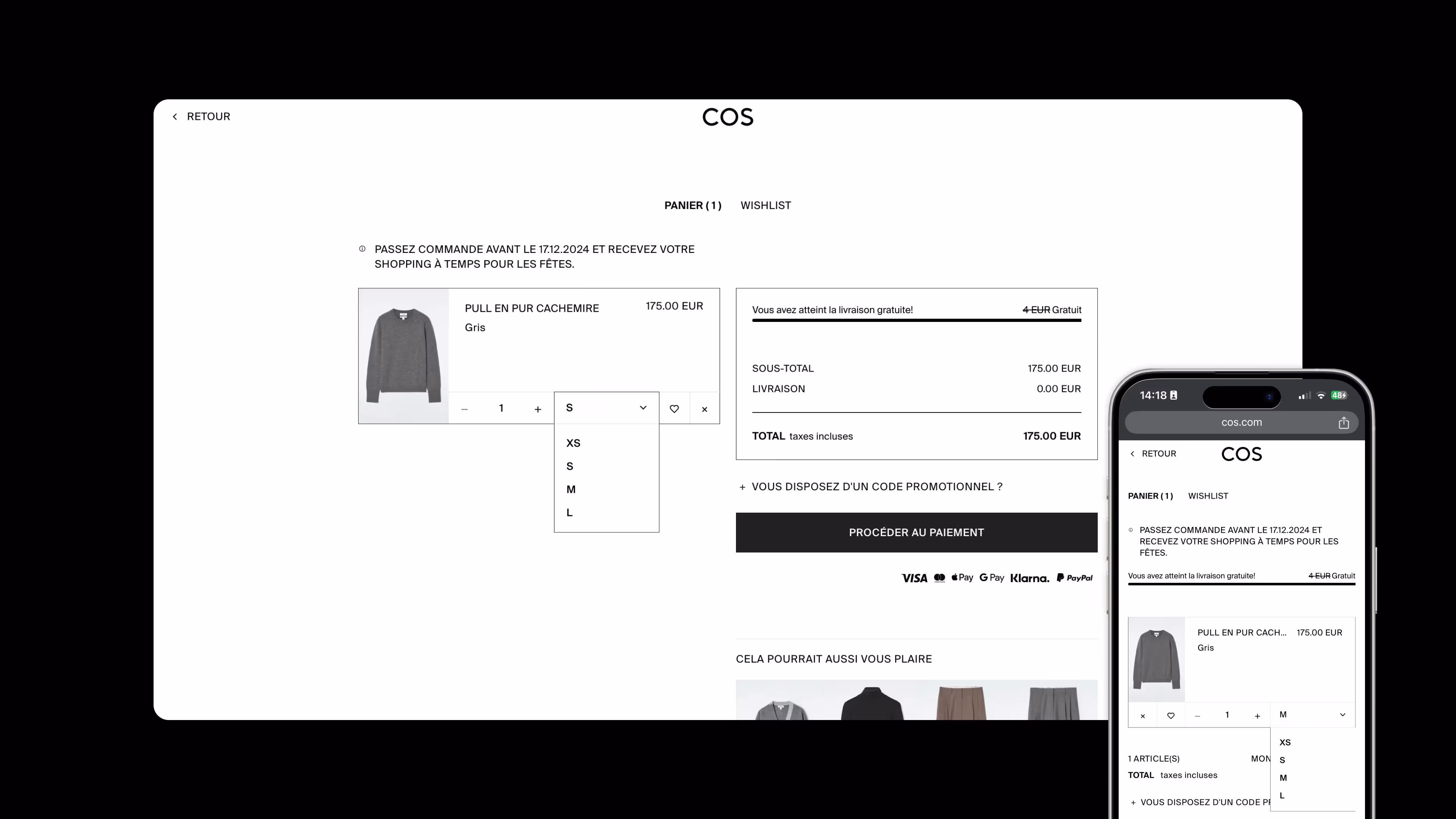 En 2023, les achats réalisés via mobile représentaient 60 % des ventes e-commerce. Pour maximiser votre taux de conversion tous périphériques confondus, il est donc plus qu’essentiel que votre page panier soit mobile first. Assurez-vous que les informations clés soient bien au-dessus de la ligne de flottaison sur smartphone, que les boutons soient suffisamment grands pour être facilement cliquables, et que rien ne soit coupé par la taille de l’écran.