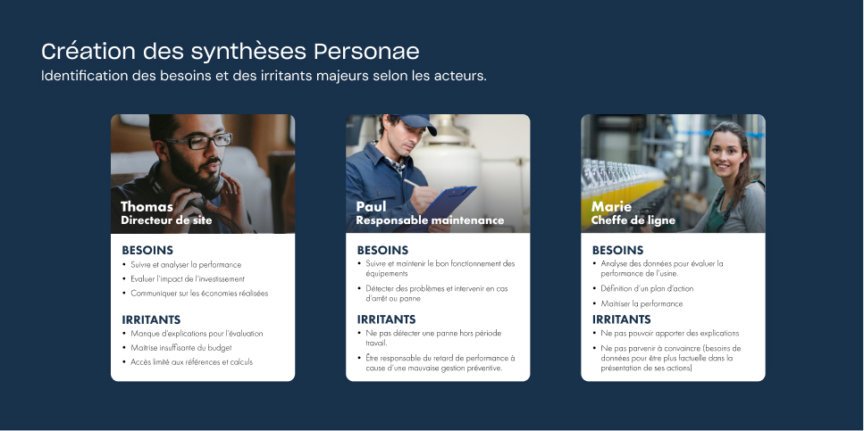 - Animation d'ateliers de Discovery basés sur 3 personas clés (Directeur de site, Responsable maintenance, Chef de ligne) pour cartographier les besoins réels.
