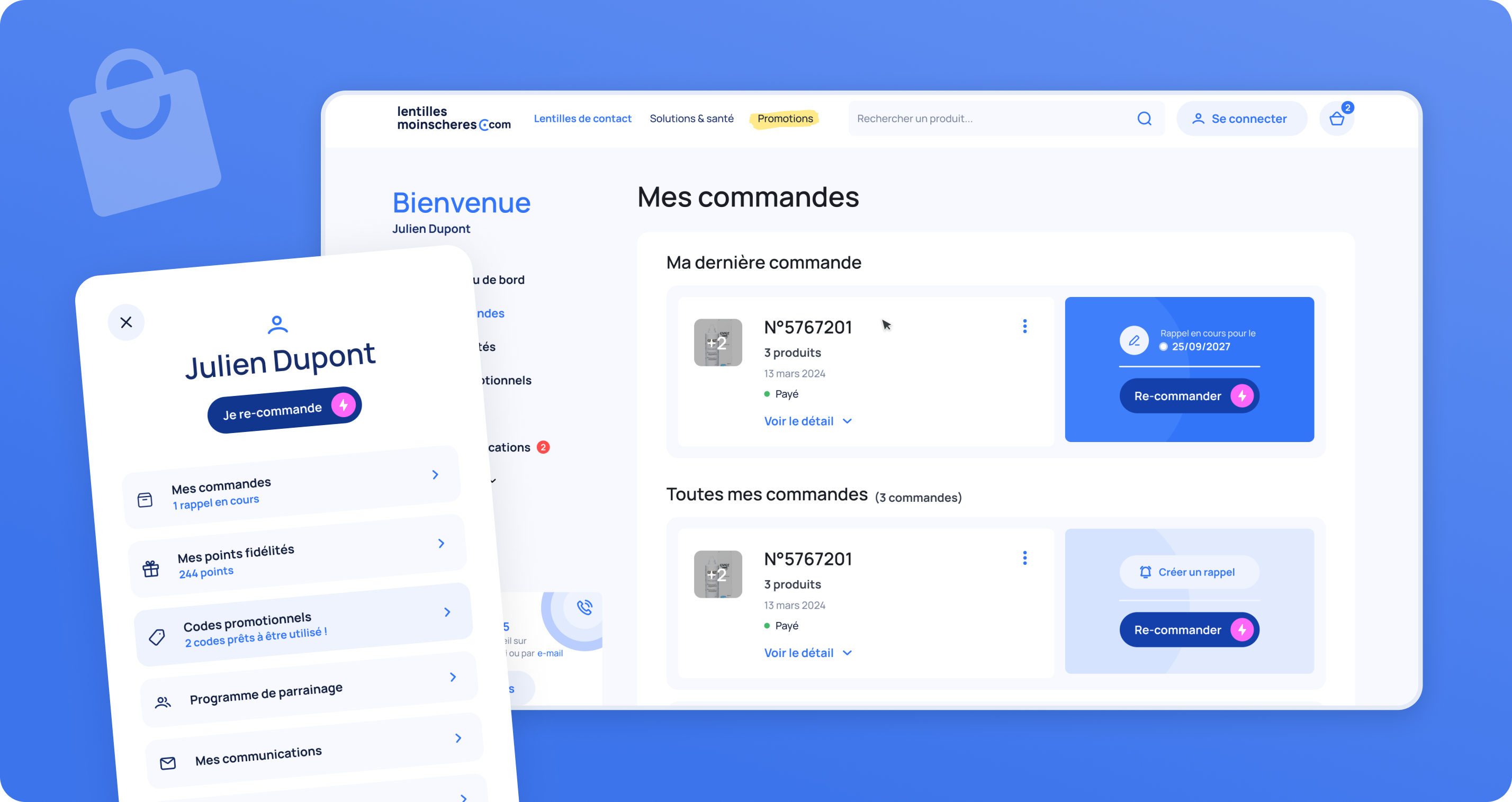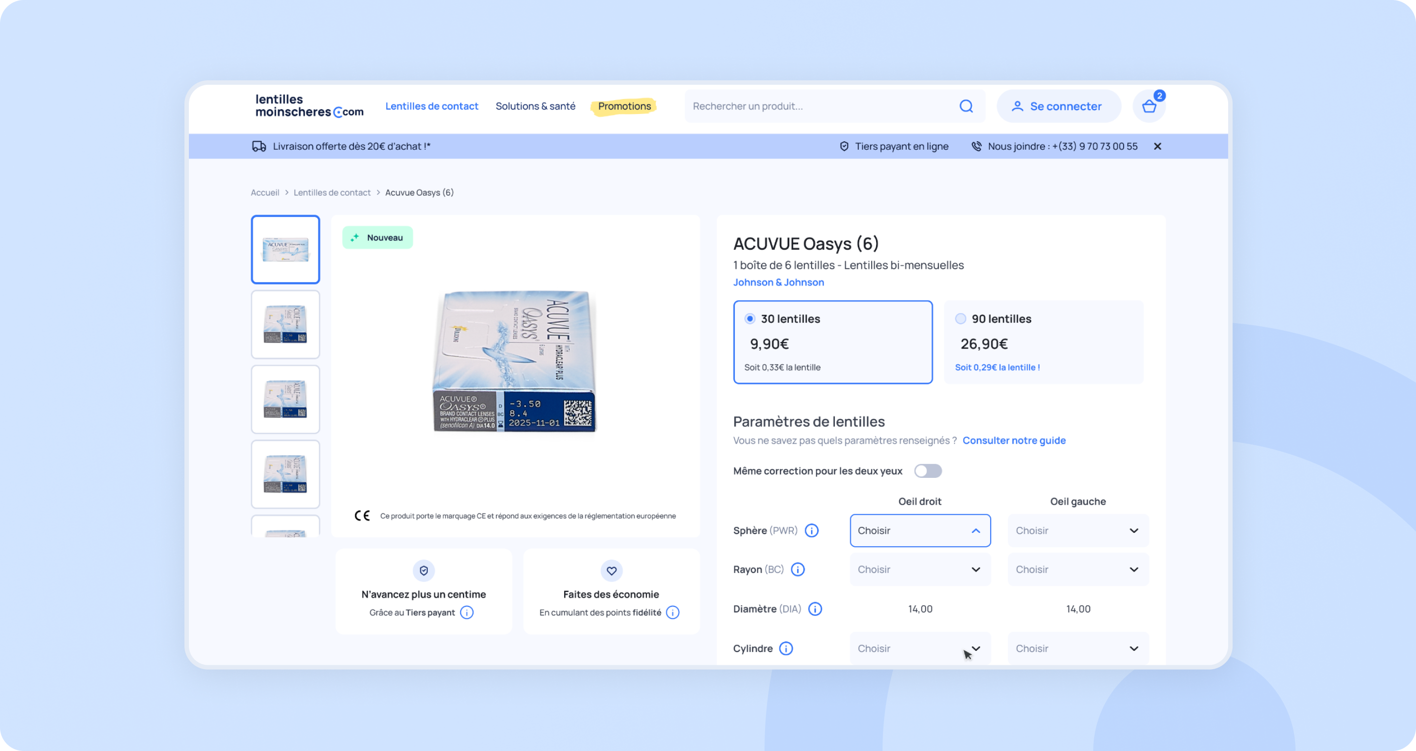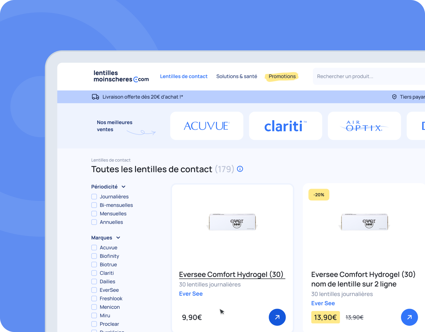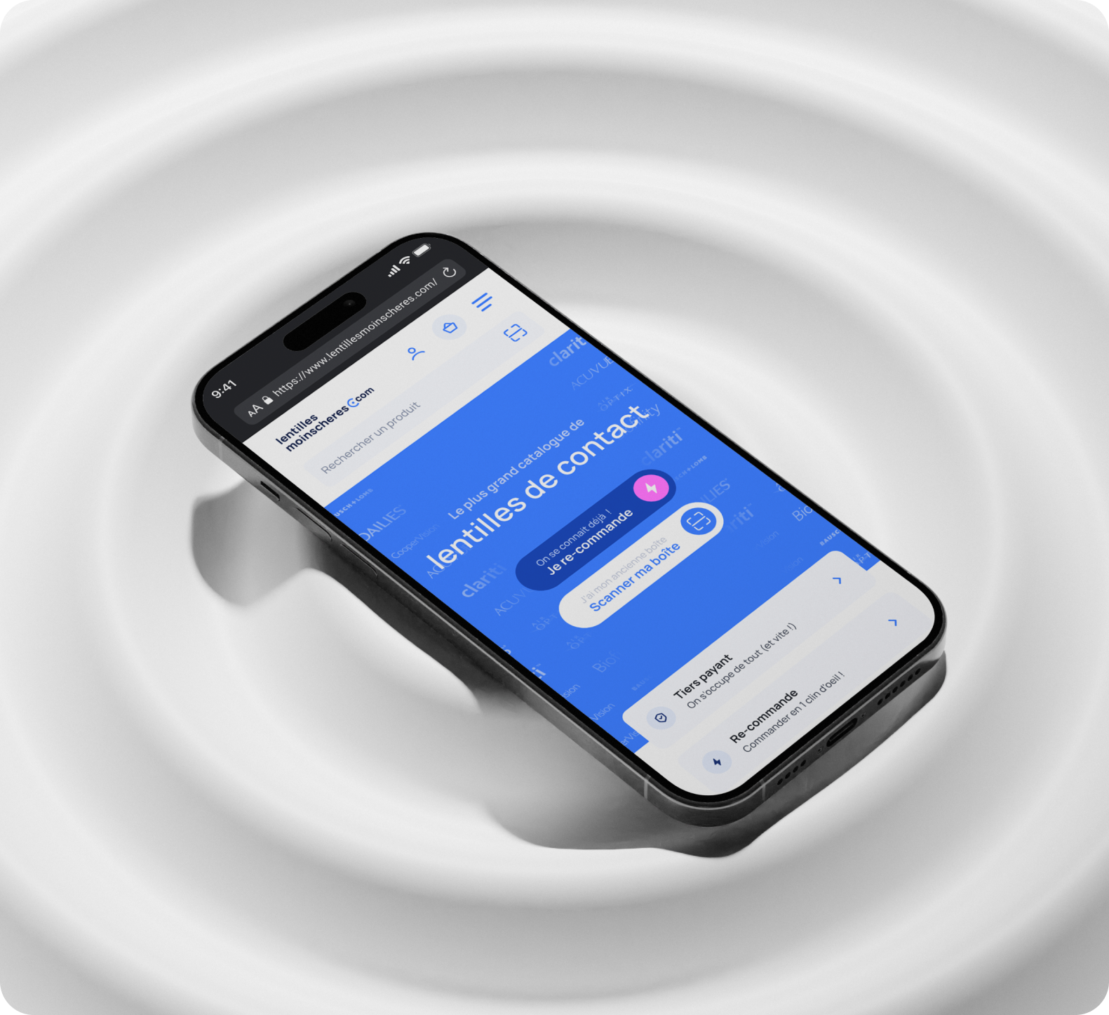Lentilles Moins Chères est un site e-commerce spécialisé dans la vente de lentilles de contact à prix compétitifs, combinant large choix, prix attractifs et service client reconnu. Malgré une forte fidélité de sa clientèle historique, le site souffrait d’une image datée et d’une expérience utilisateur en décalage avec les standards actuels du e-commerce. La problématique consistait à moderniser la plateforme pour améliorer les parcours d’achat et séduire une nouvelle audience, tout en préservant les repères identitaires et la confiance construite auprès des clients existants. Le défi était d’autant plus stratégique que le marché des lentilles est très concurrentiel et soumis à des exigences légales strictes.