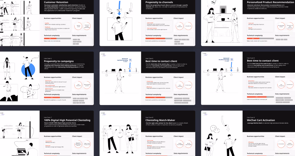 → Identification et priorisation de 10 cas d'usage stratégiques, allant de la détection de clients à haut potentiel ("High Potential Clienteling") en passant par la prédiction du "Churn" jusqu’à la recommandation produit personnalisée.