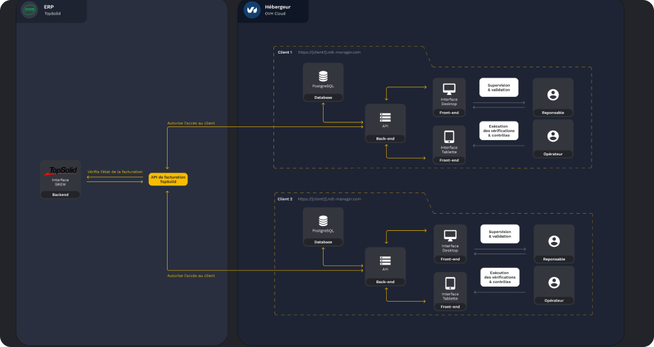 Double produit : SaaS web (admin, gestion machines/tests/utilisateurs) + app tablette terrain.