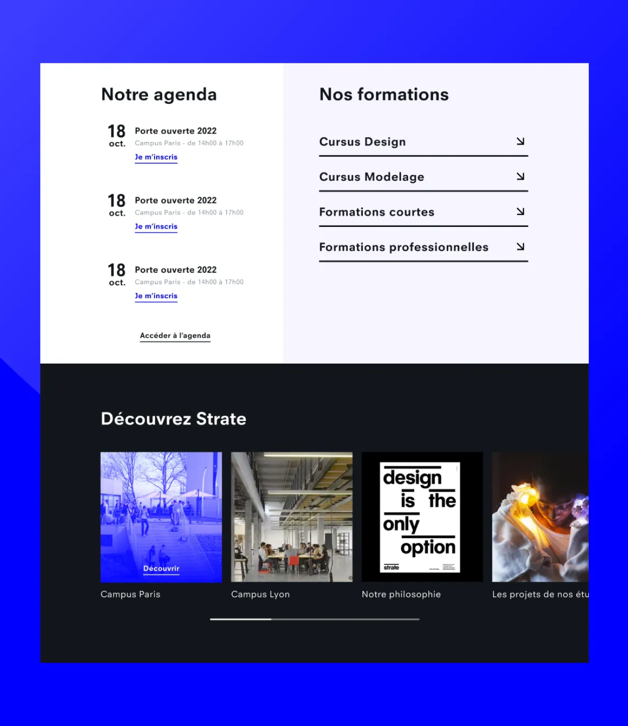 Strate, école du groupe éducatif Galiléo, avait besoin d’un nouveau site web pour consolider son positionnement d’école premium sur le marché français du design. Le site existant, jamais mis à jour depuis sa création, souffrait de plusieurs limites majeures :